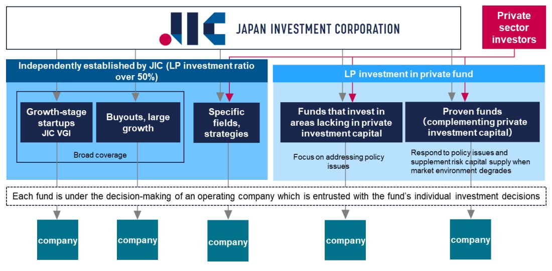 To achieve this mission, JIC established two authorized funds, JIC Venture Growth Investment and JIC Private Equity under JIC’s umbrella, and also make LP investments to funds managed by GPs in the private sector (private funds). Through investments in these funds, JIC intends to invest in strategic areas from the policy perspective.