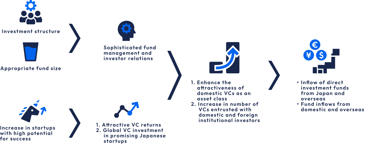 - To achieve such a cycle, it is essential that sufficient funding be supplied to startups, particularly in their growth stages, and that capital from large-scale institutional investors be expanded. These priorities have also been emphasized in various recent government initiatives. As a government‑backed investment fund, JIC has been investing with the aim of expanding the number of VC firms that manage capital from institutional investors.